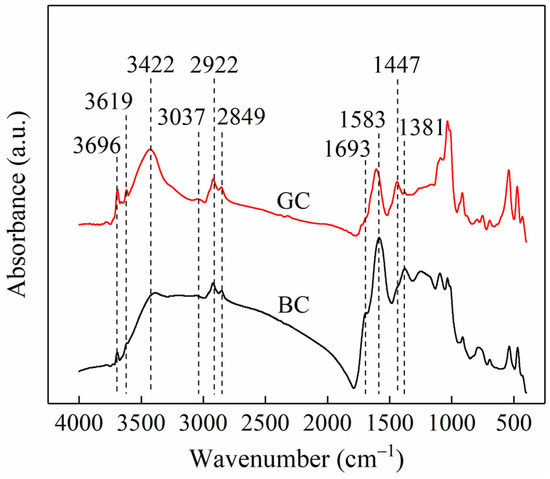 Figure 2 shows the FTIR spectra of the two coal samples. Based on assignments reported in the literature [12,13], the absorption peaks at 3629 and 3621 cm−1 are attributed to hydroxyl groups in the lattice of clay minerals. The peak at 3422 cm−1 corresponds to O-H stretching vibrations, while the band at 3037 cm−1 is assigned to aromatic C-H stretching. The peaks at 2922 and 2849 cm−1 are attributed to asymmetric and symmetric C-H stretching of methylene groups, respectively. A shoulder peak observed at 1693 cm−1 is associated with C=O stretching vibrations. The absorption at 1583 cm−1 is ascribed to aromatic C=C vibrations, the band at 1447 cm−1 to CHx bending vibrations, and the peak at 1381 cm−1 to C-H deformation in methyl groups. A comparison of the spectra of the two coal samples reveals that the absorption peaks at 3696 and 3619 cm−1 are more intense in GC than in BC, indicating a higher content of clay minerals in GC. This observation is consistent with its higher ash content. In contrast, the shoulder peak at 1693 cm−1 is more pronounced in BC than in GC, suggesting a greater abundance of C=O functional groups in the lignite sample.