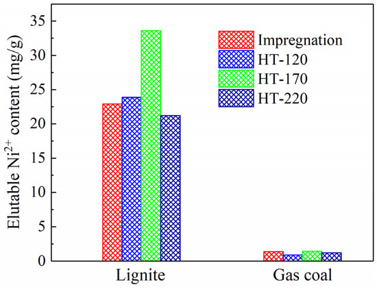 Figure 3 shows the loadings of Ni2+ on the coal samples after impregnation at room temperature and hydrothermal treatment. Almost no Ni2+ was eluted from the two types of raw coal. As shown in Figure 3, the elutable Ni2+ content increased significantly after impregnation and hydrothermal treatment. The elutable Ni2+ content in the lignite samples exceeded 20 mg/g, whereas that in the gas coal samples was considerably lower, not exceeding 2 mg/g. It is hypothesized that ion exchange is the primary mechanism for Ni2+ loading onto the coal, whereby Ni2+ replaces ions such as H+ and Na+ in the coal structure. As mentioned previously, lignite has the lowest coal rank, contains the highest abundance of carboxyl functional groups, thereby providing the largest number of ion exchange sites. This explains why the Ni loading exceeded 2% (20 mg/g) in the lignite samples.