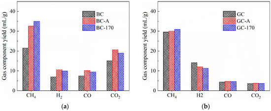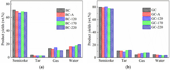 Figure 4b shows the pyrolysis product distribution of GC. After impregnation with NiCl2 solution at ambient temperature or hydrothermal treatment, the semicoke yield decreased while the yield of pyrolysis gas increased, indicating that the loaded Ni catalyst promotes the formation of gaseous products. This is consistent with reports in the literature that Ni, acting as a Lewis acid, facilitates cracking reactions [19,20]. After hydrothermal treatment at 170 and 220 °C, the tar yield increased from 10.67% to 11.30% and 11.64%, respectively, suggesting that hydrothermal treatment with NiCl2 solution enhances tar production. It is worth noting that the GC sample used in this study exhibited certain caking properties [3]. During pyrolysis, it forms a metaplast—a gas–liquid-solid three-phase colloidal system. As a transition metal, Ni can catalyze hydrogen transfer reactions, promoting the combination of hydrogen radicals with free radicals generated from BC pyrolysis, thereby facilitating tar formation. Furthermore, it has been reported that hydrothermal treatment can suppress cross-linking reactions during pyrolysis [8,9], which may also contribute to the increased tar yield observed.