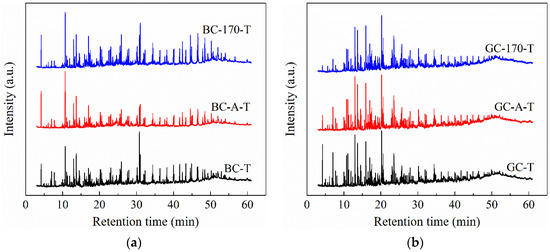As previously described, the highest Ni2+ loadings on both BC and GC were achieved after hydrothermal treatment with NiCl2 solution at 170 °C, accompanied by an increased tar yield during GC pyrolysis. To evaluate the influence of different catalyst loading methods on tar composition, the primary components of the pyrolysis tar derived from the raw coal, room-temperature impregnated coal samples and 170 °C hydrothermally treated coal samples were analyzed by GC–MS. Figure 5 displays the total ion chromatograms (TICs) of the obtained tar samples. The letter “T” appended to the coal sample name denotes the tar derived from pyrolysis of the corresponding coal sample. For instance, BC-170-T refers to the tar produced from the pyrolysis of BC-170. The major constituents of the tar were identified by matching the acquired mass spectra against the NIST mass spectral database.