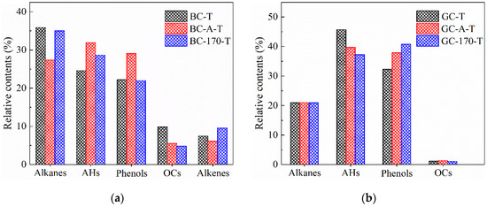 The main components of BC-T can be categorized as alkanes, alkenes, aromatic hydrocarbons (AHs), phenols and oxygen-containing compounds (OCs, primarily ketones, esters and alcohols). The major constituents of GC-T are similar to those of BC-T, with the exception that no alkenes were detected. Figure 6 illustrates the relative abundance of each compound class. As shown in the figure, alkanes, AHs and phenols constitute the predominant components of the tar, collectively accounting for more than 80% of the detectable compounds in BC-T and over 95% in GC-T. Compared to BC-T, GC-T exhibits a lower abundance of alkanes but higher proportions of AHs and phenols, along with a notably lower content of OCs. These trends are consistent with the H/C and O/C atomic ratios of the two coal samples, as presented in Table 1. This compositional difference can be attributed to the higher degree of coalification of GC, which results in a molecular structure richer in aromatic rings and poorer in aliphatic chains, accompanied by a gradual decrease in oxygen content [21,22].
