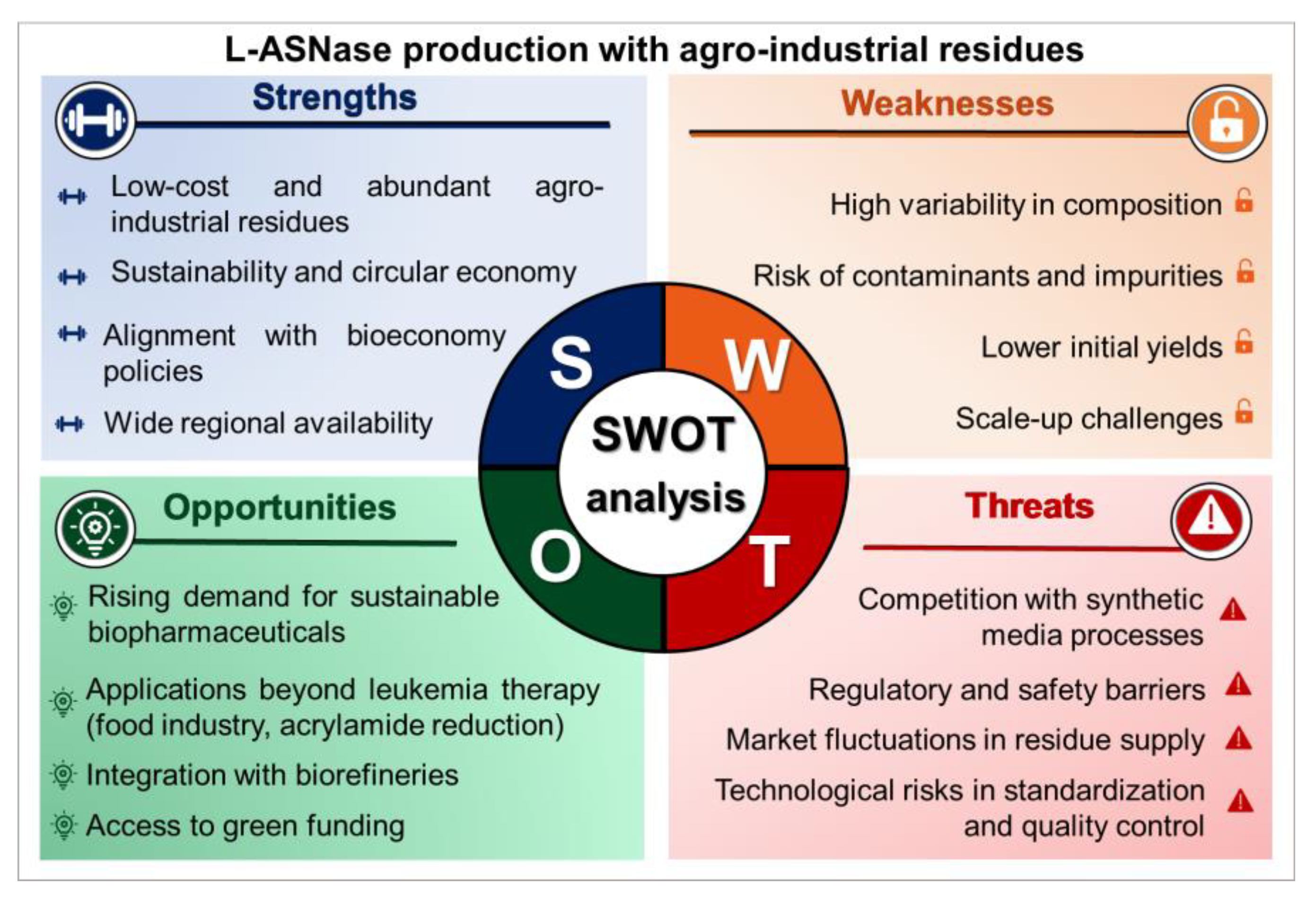 | Integration into biorefineries | Combined production of L-asparaginase, bioenergy, enzymes, and biopolymers within multiproduct platforms. | Product diversification and greater economic valorization of residues. | [79,82,83] |