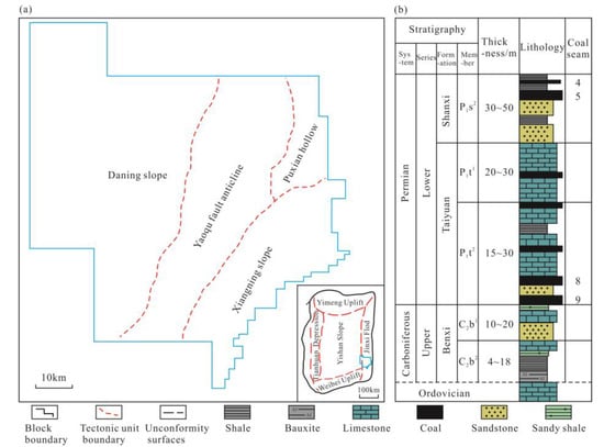 Tectonic outline and coal-bearing strata of Daning Jixian block: (a) Tectonic outline; (b) coal-bearing strata (cited from Reference [10]).