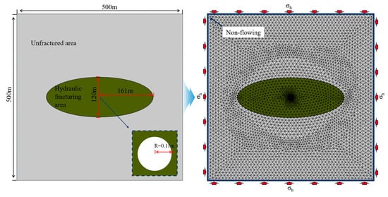 The low permeability and poor pore connectivity of deep coal seams necessitate large-scale hydraulic fracturing. This process creates interconnected pathways among matrix pores, natural fractures, and artificial fractures to enable commercial gas production [11]. Based on the geological and engineering context of the study area, a physical model for production simulation of deep CBM wells was constructed targeting the No. 8 coal seam. The model dimensions are set as a 500 m × 500 m rectangle, with a wellbore radius of 0.11 m. According to microseismic fracture monitoring results in the study area, the hydraulic fracturing zone is configured as an elliptical region with a fracture length of approximately 322 m and a width of 120 m (Figure 2).