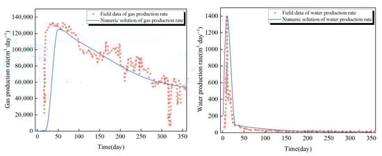 Simulated daily gas and water production rates closely match the actual field data. The simulation error for daily gas production is 13.88%, while that for daily water production is 17.2% (Figure 4), thereby validating the accuracy of the mathematical model. Some deviations exist in the history matching of daily gas production, primarily due to frequent adjustments in the production technical scheme during the extraction process—such adjustments led to significant fluctuations in gas production. In particular, field operations such as suspending pumps for well workover or changes in the production technical scheme at specific time steps could not be effectively represented in the simulation. The discrepancy between the field data and the simulation results was quantified with the following equation [33]:
