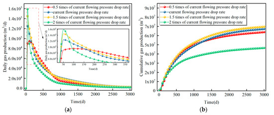 (a) Daily Gas Production Rate and (b) Cumulative Gas Production of CBM Wells under Different Flowing Pressure Drop Rates.