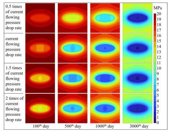Simulation results indicate that increasing the flowing pressure drop rate enhances pressure depletion only during the early production stage. In the subsequent stable and decline stages, a further increase in the drop rate does not yield a greater depletion extent.