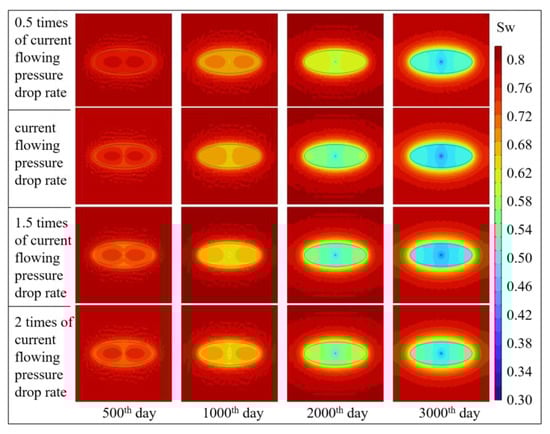A comparison of water saturation distributions under different flowing pressure drop rates reveals that by day 500 of production, increasing the flowing pressure drop rate accelerates the decrease in water saturation. Due to the higher permeability in the fractured zone, water saturation in this region decreases significantly, while little change is observed in the unstimulated zone (Figure 8). Between days 1000 and 3000 of production, water saturation under a flowing pressure drop rate of twice the initial rate gradually exceeds values observed under other drawdown strategies (Figure 8).