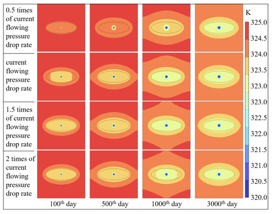 A comparison of reservoir temperature distributions under different drawdown rates reveals a distinct evolutionary pattern. By day 500, a higher rate accelerates cooldown, with a more pronounced effect in the fractured zone. Subsequently, between days 1000 and 2000, the temperature under the 2× rate surpasses that of other cases. Finally, the temperature stabilizes across all scenarios by day 3000 (Figure 9).