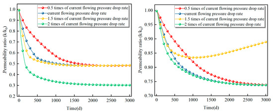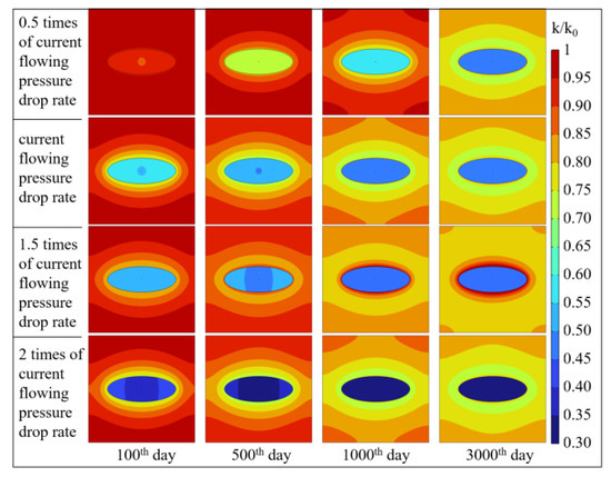 Comparison of coal reservoir permeability under different flowing pressure drop rates reveals that the most significant decrease occurs within the stimulated (fractured) zone, with a maximum reduction of 69.6%, whereas the maximum reduction in the unstimulated zone is 26.2% (Figure 12). Specifically, within the first 1500 days of production, the permeability decline in the stimulated zone intensifies with increasing flowing pressure drop rates. After 1500 days, the permeability gradually stabilizes. In the unstimulated zone, the permeability reduction also increases with higher flowing pressure drop rates during the initial 400 days. Beyond 400 days, under the current, 0.5×, and 2× flowing pressure drop rates, permeability exhibits a slow decline followed by stabilization. In contrast, under the 1.5× flowing pressure drop rate, permeability rebounds, recovering to 88.9% by the end of the production period (Figure 13).