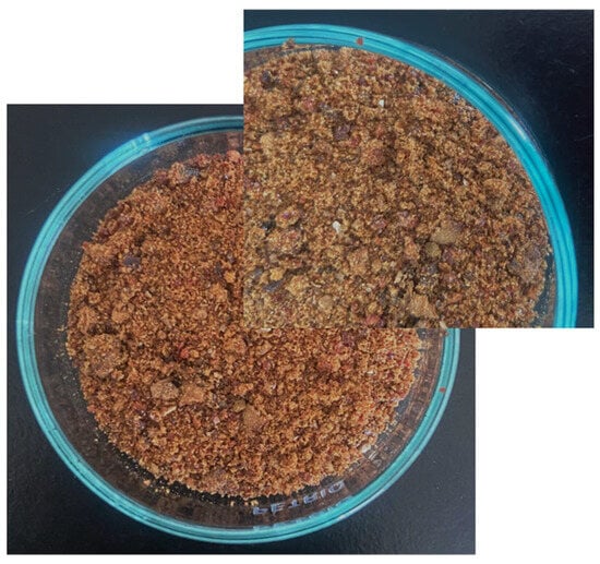 As shown in Table 1, approximately 244 g of lyophilised polyphenolic extract was obtained from the extraction process, with an average mass yield of 17% ± 1%. The preliminary morphological and sensory properties were visually evaluated by an untrained panel. Under the drying conditions used, a brown powder with a sweet smell was obtained. However, it was highly hygroscopic (Figure 1), meaning it readily absorbed moisture, which made it difficult to handle.