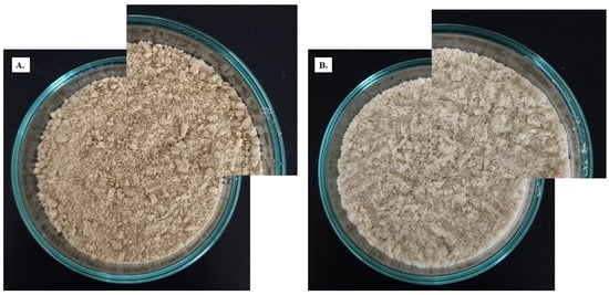 LPEs were encapsulated using GA-G and SA-G as wall materials. As shown in Figure 2, both formulations produced a loose beige powder, resulting from the blend of white encapsulation materials with brown CPH polyphenols. The powders were easily manageable, non-adherent, and when visually comparing the lyophilised non-encapsulated extracts with those encapsulated by CC, it is observed that the former undergo hydration (swelling) upon contact with the environment, whereas the latter retain the characteristics of a dry powder.