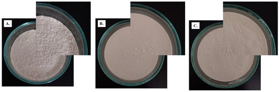 SD produced microcapsules for each encapsulant at three selected concentrations. Figure 3 presents the microcapsules obtained at the concentrations yielding the highest loading efficiencies. All three encapsulants generated a finer, looser beige powder compared to CC. Similarly, the resulting powder was easily manageable, non-adherent, and resistant to rapid moisture absorption, facilitating its potential inclusion in food and pharmaceutical formulations.