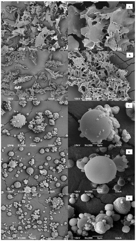 Scanning Electron Micrographs of polyphenol microcapsules obtained by complex coacervation: (A). gum arabic–gelatin and (B). sodium alginate–gelatin; and by spray-drying: (C). gum arabic, (D). sodium alginate, and (E). chitosan.