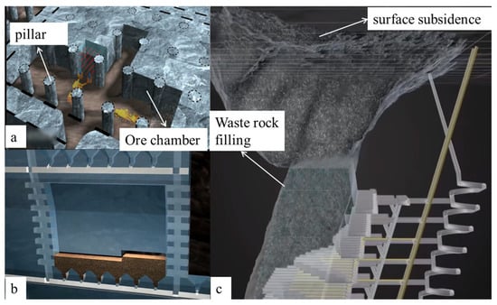 Schematic diagram of mining method: (a) room pillar mining method, (b) retention mining method, and (c) collapse mining method.
