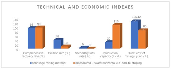 Although the open-stope method has been developed to a certain extent both domestically and internationally, it still faces problems such as low mechanization, low labor efficiency, safety hazards, high pressure on tailing surface storage, high loss and impoverishment rates, and accumulation of ore funds, which are no longer suitable for China’s safety production and green mining development concept. Figure 2 below presents a comparison of the technical and economic indicators between the traditional open-stope shrinkage method and the mechanized upward horizontal cut-and-fill stoping method adopted in a Chinese mine.