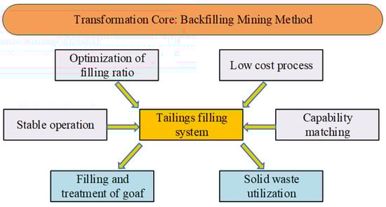 The key to the backfill mining method lies in the backfill process and backfill system. The constructed filling system not only needs to meet the needs of filling mining, goaf management, and tailing disposal at the same time; it also needs to meet the high standards of “reliable operation, capacity matching, low operating costs, and controllable investment” (see Figure 3). Therefore, key technical parameters such as tailing pipeline transportation and filling ratio should be obtained through experimental research, theoretical analysis, and scheme comparison to determine a suitable low-cost filling-process plan, optimize a suitable filling-preparation site plan, ensure the reliability of the filling system, and control filling costs in order to reduce investment and operating costs.