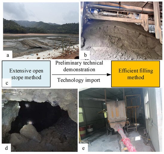 On the basis of filling mining and the filling treatment of the goaf to absorb a large amount of tailings, researchers in the mining industry need to further strengthen the research on the comprehensive utilization technology of residual tailings and waste rock, achieve the reduction and resource utilization of mine solid waste, and solve the problem of tailing pond capacity depletion and huge investment in new tailing pond construction (see Figure 4a,b).