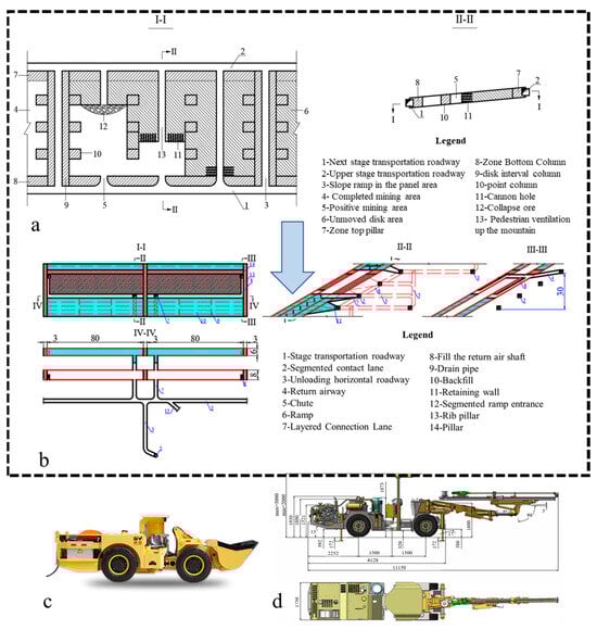 Transformation plan and mechanized equipment: (a) room and pillar method, (b) mechanized upward horizontal-layered filling method, (c) load–haul–dump unit, and (d) Boomer K41 hydraulic rock-drilling rig.