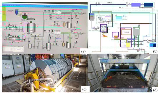 At the same time, after 3 years of construction, the first low-cost full tailing filling system in China, covering an area of 6840 square meters, was built, with a total investment of RMB 12 million, as shown in Figure 8a,b. Supporting facilities included a filtration room (Figure 8c), vibrating screen room (Figure 8d), tailing storage shed, cement silo, batching silo, etc. This filling system will vibrate and screen the flotation tailings, and use medium-to-fine-grained tailings for filling the underground goaf. Coarse-grained tailings are rich in elements such as iron and silicon, and after dehydration, they will be sold as building materials, achieving zero discharge of tailings on the surface.