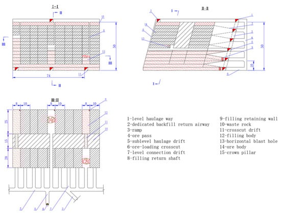 Due to the high ore grade of the Suichang Gold Mine, in order to improve the recovery rate, the retention method of mining first uses concrete to replace the ore pillars, and then it mines the ore room, resulting in a complex mining process and low efficiency [18]. At the same time, the use of pneumatic rock drills and electric rakes in production results in low mining efficiency, with a production capacity of only 30 t/d. The primary impoverishment rate in mining is as high as 40%, while there is a secondary impoverishment rate of up to 5% [33]. The continuous use of the retention method for mining has generated a large amount of tailings after beneficiation, and these tailings cannot be used to backfill the goaf; in addition, the tailing pond of the Suichang Gold Mine is approaching its design height, leading to the possibility of mine shutdown. Therefore, Suichang Gold Mine plans to use tailings to form filling bodies to treat the existing goaf and the goaf mined by the shallow-hole retention method; transform the existing mining method into an upward horizontal-layered filling method that can utilize tailings; and equip it with mechanized mining equipment to achieve mechanized mining and filling and underground trackless transportation.