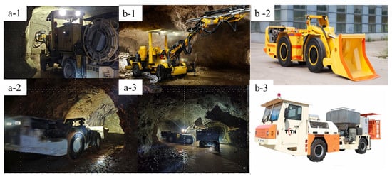 (a) Equipment configuration for conventional drill-blast and mechanical cutting. (a-1): Traditional drilling and rock drilling machine. (a-2): Traditional cutting machine. (a-3): Traditional Scraper (b) Mechanized mining equipment. (b-1): Mechanized rock drill. (b-2): Mechanized electric loader. (b-3): Mechanized medication trolley.