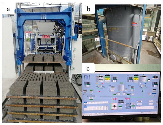 Tailing brick-making and mine-filling system diagram. (a) Results of tailing brick making. (b) Horizontal sand storage. (c) Filling-process flow.