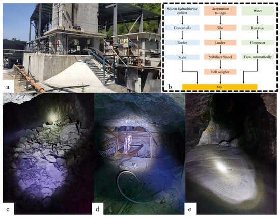 Mechanized mining in the Suichang Gold Mine: (a) tailing backfill system; (b) process flowchart of cyanide-removal tailing backfilling; (c) bottom structure of 528 m level; (d) the chute of 540 m level; and (e) the condition of the baseplate after filling the goaf [35].