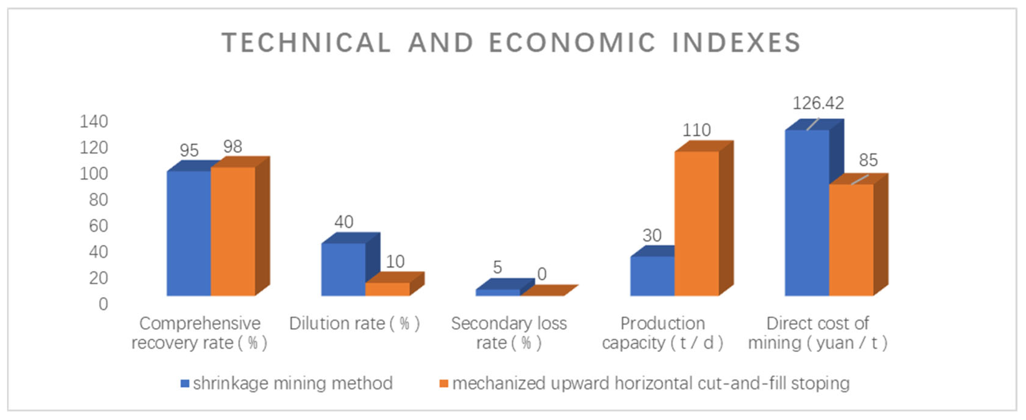 Figure 2 below presents a comparison of the technical and economic indicators between the traditional open-stope shrinkage method and the mechanized upward horizontal cut-and-fill stoping method adopted in a Chinese mine.