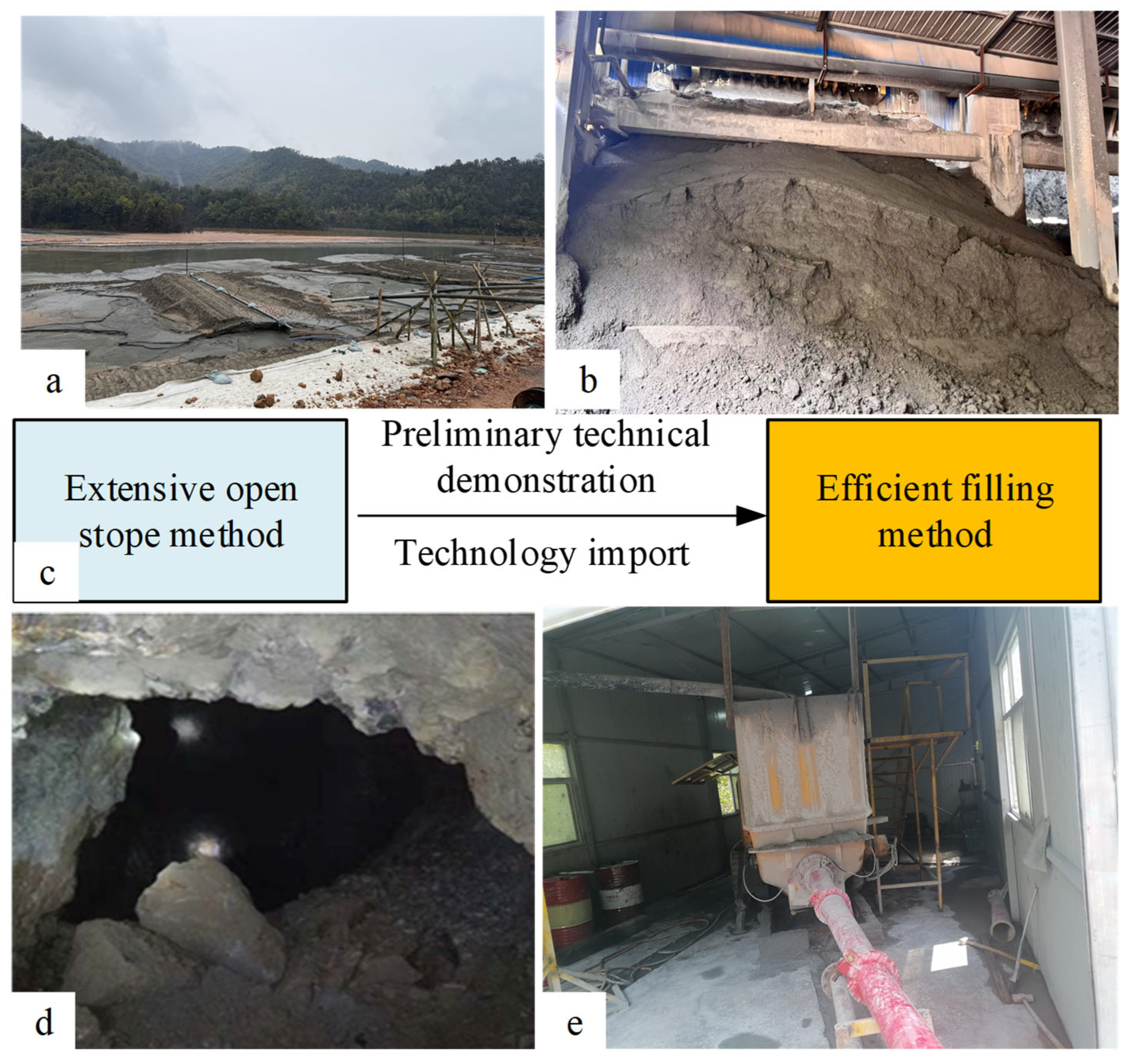 Figure 12b,c for filling equipment and process flow), achieving partial consumption of tailings. However, due to ore depletion, the filling operation still cannot fully absorb all tailings. A plan for the reuse of tailings has been proposed to address this issue.