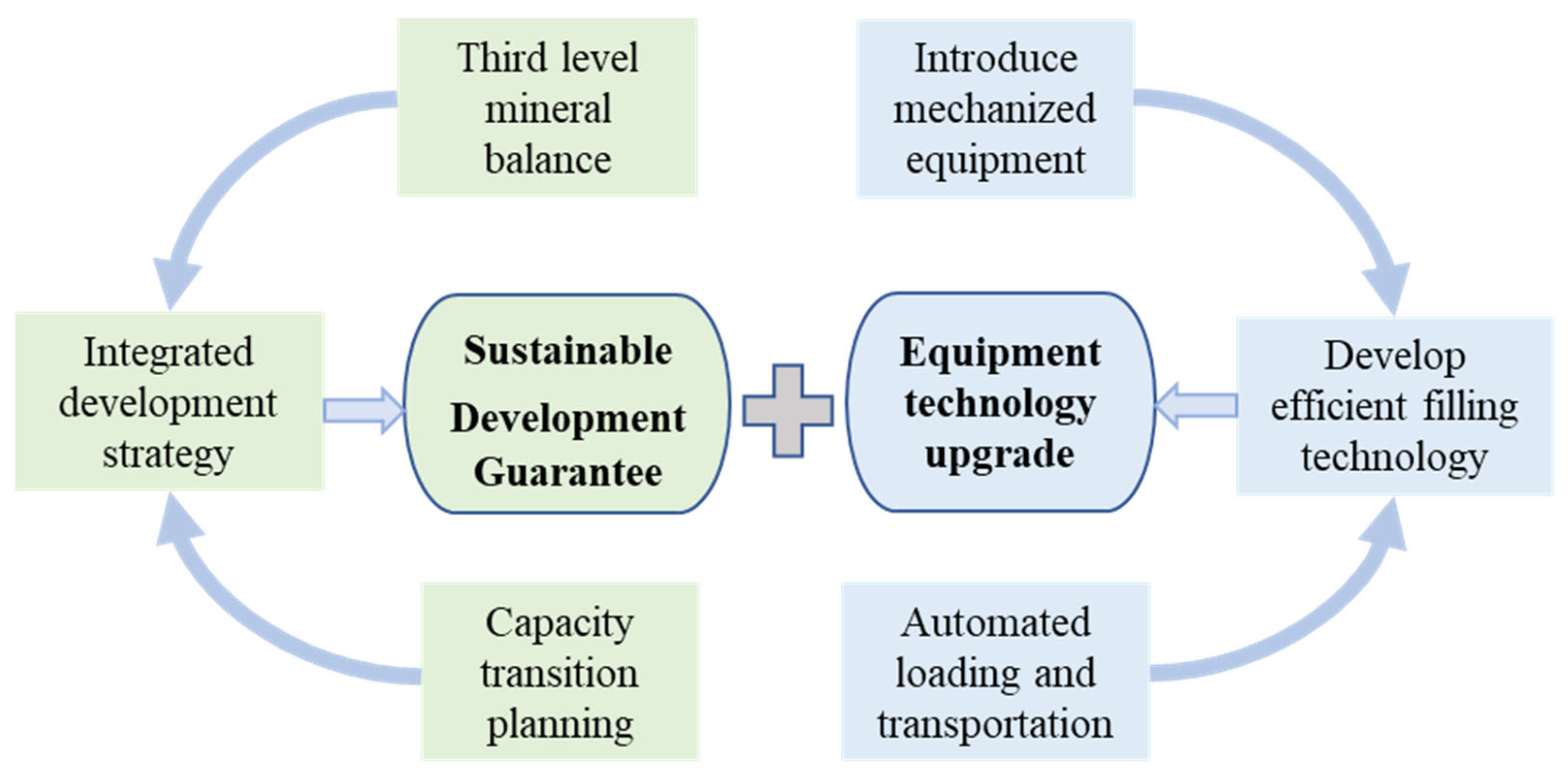 Based on the resource-endowment conditions of each mine, researchers in the mining sector need to develop new high-efficiency and low-cost backfill mining technologies that meet the existing mining-technology conditions, introduce mechanized mining equipment, and maximize the recovery efficiency and mining intensity of resources. They also need to realize the full process mechanization of mining, excavation, loading, transportation, lifting, and beneficiation, reducing labor costs and safety risks; promote mechanized and intensive integrated development; and transform resource advantages into economic advantages (see