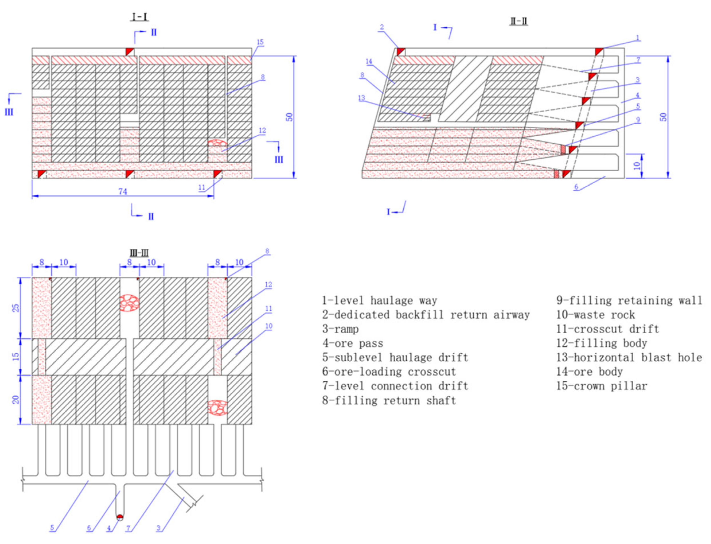 26]. The comprehensive ore retention method is proposed to adapt better to changes in the dip angle of the ore body, while the wall-cutting and filling method is proposed to solve the problem of impoverishment in the recovery of high-grade ultra-thin ore veins [