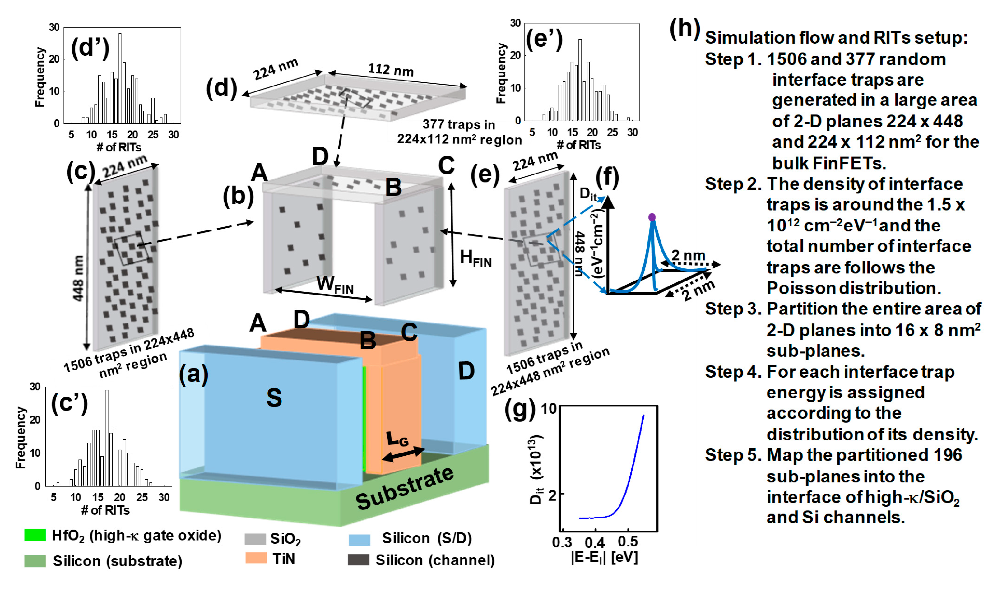 - Kola, S.R.; Chuang, M.H.; Li, Y. Characteristics Fluctuation of Sub-3-Nm Bulk FinFET Devices Induced by Random Interface Traps. In Proceedings of the 2023 IEEE 23rd International Conference on Nanotechnology (NANO), Jeju City, Republic of Korea, 2–5 July 2023; pp. 917–922. [Google Scholar] [CrossRef]