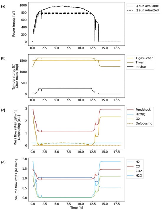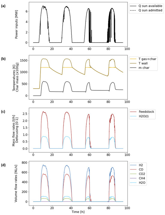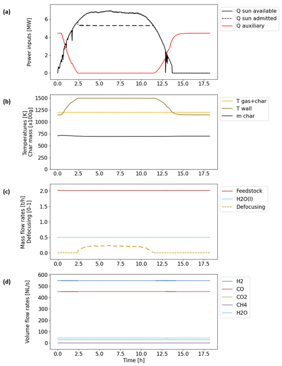 th) is then performed to identify the potential yearly performance results of hybridized gasification and to highlight the impact of design choices on these results. In particular, the role of potential sunlight defocusing during clear days is addressed to maintain a constant syngas production rate while avoiding reactor overheating. The dynamic model uses high time resolutions (1 s for direct solar irradiance data) and chemical dynamics integration to yield yearly results. To date, such a dynamic control tool applied to solar thermochemical fuel production processes under various operation strategies has never been developed. The control tool can be used to simulate solar–autothermal hybridized gasification, enabling a controlled H