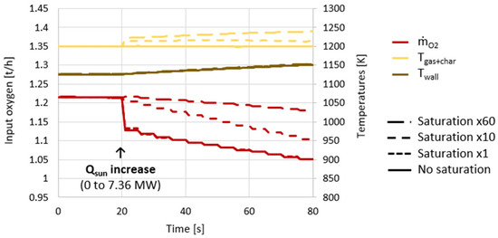 34]. Finally, in a molten-salt reactor, injecting oxygen maintained the medium temperature at about 1210 K while decreasing the solar power input [