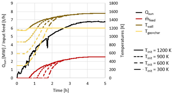 2]. However, solar thermochemical processes require the handling of solar power fluctuations for continuous day and night processing. Several methods have been proposed to mitigate the effects of fluctuating solar power availability on solar gasification. The benefit of heat storage in maintaining a sufficiently high temperature throughout day–night operations can be considered. The thermal inertia of reactors can be improved to buffer solar power variations. Internal heat storage can be achieved in molten-salt reactor designs [