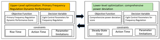 There are multiple key control parameters that significantly affect the frequency regulation performance of deep peak shaving heating units in terms of operation and multi-objective control, mainly including: amplification factor of speed deviation , PID proportional coefficient of the speed control system , time constant of the hydraulic servo motor , steam volume time constant , proportional coefficient of high-pressure cylinder , extraction volume time constant , PID proportional coefficient of the butterfly valve , time constant of the butterfly valve hydraulic servo motor, etc. According to the influence mechanism of parameter effects, two types of control objectives are divided: (1) the dynamic performance parameters of primary frequency regulation in transient processes, including overshoot and regulation time during frequency regulation; (2) the steady-state power deviation value of the steady-state process and the deviation of the heating power output value from the set value. For these two objectives, a two-layer optimization method can be used, and the transfer relationship is shown in Figure 1.