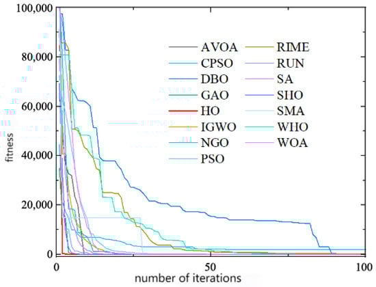 The HO algorithm has strong robustness in diversified benchmark tests and significantly outperforms algorithms such as WOA, GWO, and PSO in global convergence ability, maintaining efficient convergence in high-dimensional adaptability, overcoming the curse of dimensionality in high-dimensional spaces caused by algorithms such as PSO. For multimodal problems, the HO algorithm jumps out of local optima by dynamically adjusting the search direction. Analyzing and comparing the convergence of the HO algorithm with other major algorithms, as shown in Figure 3.