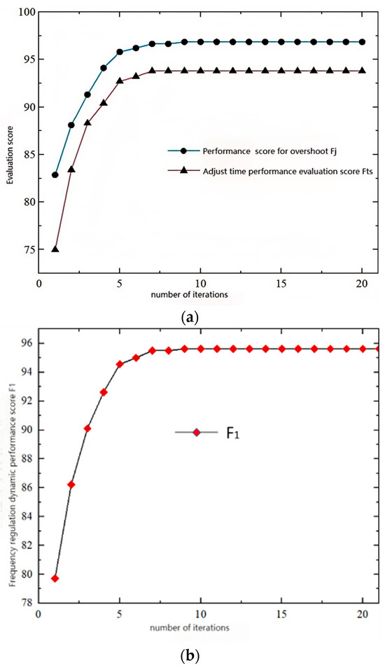 At a set operating condition value of 0.35 (p.u.) and a reference value of 300 MW, the device heats and extracts steam during the simulation time of t = 100 s. At simulation time t = 200 s, the frequency reference step size changes from 3000 r/min to 3011 r/min. At the input end of the speed control system, a step disturbance with a unit value of is set. The maximum number of iterations for upper-level optimization is set to 20. During the optimization process, the overshoot evaluation score and tuning time evaluation score obtained from each iteration of the frequency modulation process are recorded as shown in Figure 5.