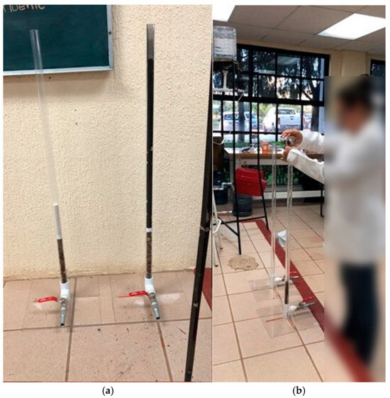 The column packing materials used were agave bagasse biochar and zeolite. The biochar was obtained commercially. The process specifications are as follows: the agave bagasse biochar was obtained through a pyrolyzing oven based on LP gas, with a batch process with an average temperature of 450–700 °C and a yield of 50%. The raw material is produced with a humidity of 10%. In the case of biochar, it was not altered; instead, it was used under physical and chemical conditions after manufacturing.
