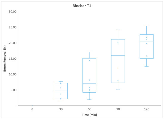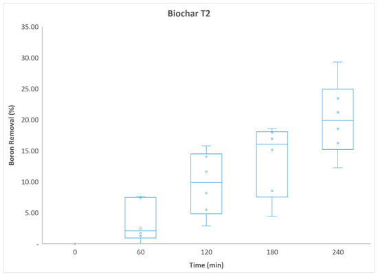 Figure 3 also shows the results of boron removal, using biochar as packaging and a contact time of 4 h, referred to as contact time 2 (T2). The results show that the average removal rate for C1 was 14.23% with a SD of ±2.78%, while C2 showed an average removal rate of 18.56% with a SD of ±0.00%, and finally, T3 showed a removal rate of 26.38% with a SD of ±4.15%. The same behavior can be observed in T1, as the removal increased with the decrease in boron concentration at the beginning of the experiment, corresponding to time 0. The increase in the removal of C2 compared to C1 was 5.63%, and that of C3, compared to C2, was 6.51%.