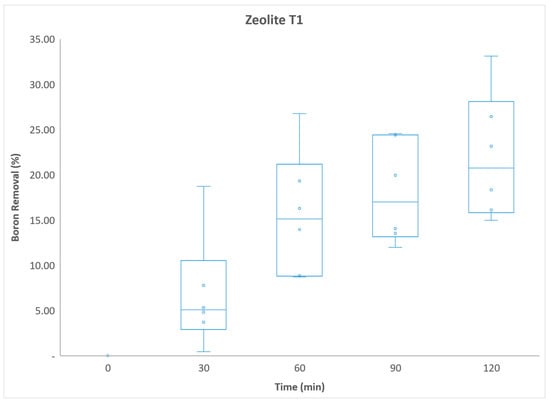 Ravelo Polo utilized chitosan–nickel beads to remove boron concentrations ranging from 5 to 50 ppm. The results showed that the boron concentration decreased by 90% when compared to the inlet concentrations, presented values of 5 mg/L, and the outlet concentrations, with values in a range of 7.9 mg/L and 0.1 mg/L. When comparing the results with the requirements of European standards (1 ppm), removing boron using chitosan–nickel beads does not meet these standards in most of the samples [26]. Canadell used alginate and alginate–alumina beads to remove boron from water. Alginate is a polysaccharide obtained from algae. The concentrations used in this study were 5 and 25 mg/L. The two types of beads were used in two ways: wet and dry. To the solutions with the known concentration of boron, either alginate or alginate/alumina beads were added and left in agitation for 3 days at 50 rpm; two pH levels were handled in the solution: 7 and 11 [27].