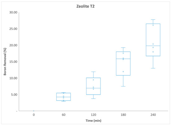 In the second phase, experimental runs were carried out using four hours of contact time; two replicates were performed with each of the previously selected boron concentrations (8, 4, and 2 mg/L). Five samples were also collected; the first one corresponded to time 0 and the following ones were collected at 60 min intervals.