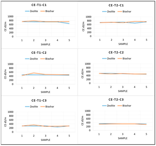 Three treatments were evaluated with different boron concentrations and contact times: Treatment 1 (C1) used a boron concentration of 8.921 mg/L; Treatment 2 (C2) used a boron concentration of 4.473 mg/L; and Treatment 3 (C3) used a boron concentration of 2.545 mg/L. The experiment was conducted with two contact times: Contact Time 1 corresponding to 2 h (T1) and Contact Time 2 corresponding to 4 h (T2).