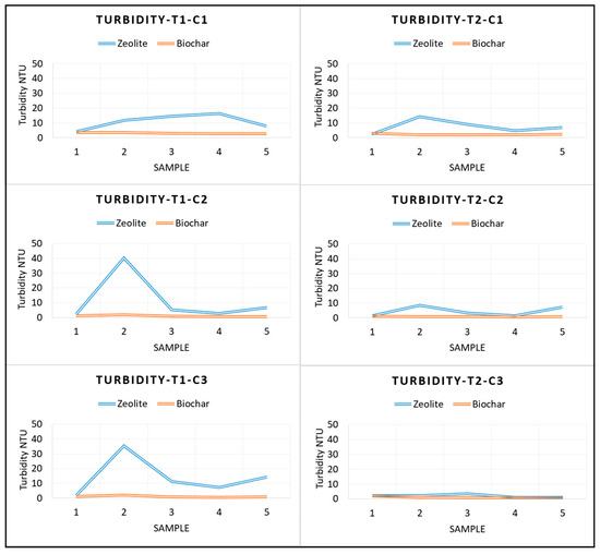 Turbidity (NTU) in the two contact times, three treatments, and two packing materials.