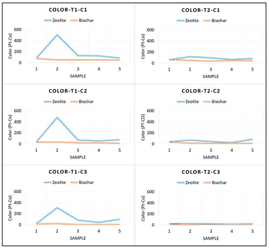 Color. Color is one of the organoleptic parameters that can express good water quality. Color is closely related to turbidity due to the accumulation of suspended particles and some substances that are diluted in the water; it has a diffuse appearance, so that, at first glance, we denote dirty water, and it also prevents natural light from penetrating the water in its entirety, which is the cause of the poor reproduction of microorganisms [48].