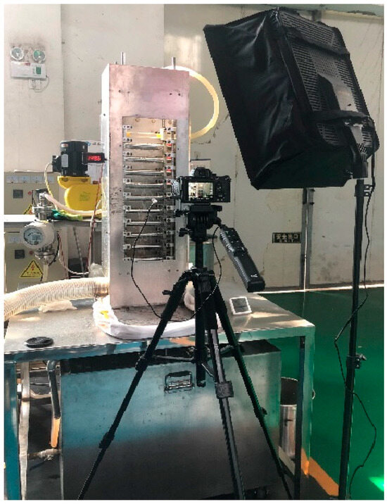 Schematic and physical diagrams of the horizontal tube falling film circulation system are shown in Figure 1 and Figure 2, respectively. The centrifugal pump has a flow range of 0~400 L/h and a head of 15.5 m; the flow control valve enables stable flow adjustment. The metal tube float flowmeter has a measuring range of 0~250 L/h and an accuracy class of 1.0. The test section includes a liquid distribution tube, falling film tubes, and a cross optical axis system. The distribution tube and falling film tubes are fixed via side sliders; the 10-row single-column falling film tubes have adjustable spacing using the cross optical axis systems. A level meter and plumb bob calibrate the tube horizontally and vertically. The organic glass distribution tube (d = 0.02 m, wall thickness = 0.001 m, length = 0.3 m) has bottom spray holes (d = 0.001 m, spacing = 0.007 m, total spray length = 0.1 m). The stainless steel falling film tubes have polished outer surfaces (Ra3.2) and a contact angle of 60.3° at 25 °C—measured per standard protocols using a high-precision sessile drop meter (resolution 0.01°, error ± 0.1°) in a constant temperature/humidity chamber (25 ± 0.5 °C, RH 50 ± 2%), 5 μL working fluid (same as film tests) was deposited via micro-syringe (0.1 μL precision). After 30 s stabilization, droplet contours (10 frames/s) were analyzed via Young–Laplace fitting; 5 parallel tests gave 60.1–60.5° (average 60.3°, RSD 0.3% < typical 2% error, confirming reliability). The sealed test section prevents air flow interference (left/right sides: highly transparent glass; front: 0.2 m × 0.6 m visualization window for falling liquid film spreading). Ambient air disturbance elimination was confirmed by repeated tests at 0.5 m/s external air flow (no wetting area change, ±1%). Axial wetting uniformity was validated via 5-point measurements (RSD < 3%, no significant variation). The tube surface was wiped with absolute ethanol before each experiment to remove oil stains and residual impurities, and rinsed with deionized water immediately after each experiment to avoid surface contamination from liquid residues. All experiments were conducted in a constant temperature and humidity environment (25 ± 0.5 °C, RH 50 ± 2%) to eliminate the impact of temperature/humidity changes on surface tension and contact angle.