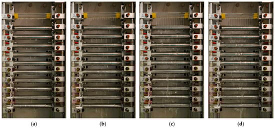 In this experiment, the same liquid was used as the working fluid, with fluid temperature, density, μ, and Ls kept consistent. The Rel values corresponding to the different volume flow rates are listed in Table 2; the four Rel values correspond to the inter-tube flow patterns (droplet, columnar, column-sheet, sheet flow), respectively (Figure 3). The flow pattern classification is fully consistent with Killion’s criteria, and detailed descriptions can be found in Reference [5]. To characterize the local wettability of each tube row in the test section, the “wetting ratio” was used—defined as the ratio of the tube surface’s wetted area to its total surface area. A larger value indicates better single tube wettability, and its calculation formula is given by Equation (3).