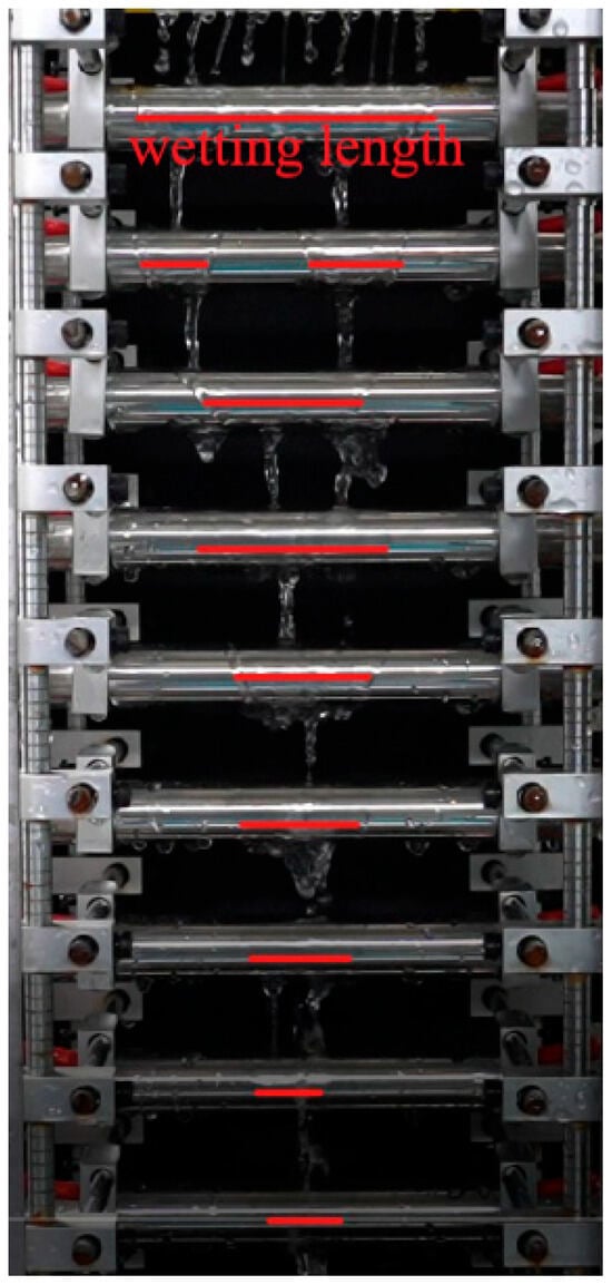 Therefore, how do the tube diameter (d), the tube spacing (s), and the liquid film Reynolds number (Rel) synergistically affect the wettability of 10-row horizontal tubes (a common industrial configuration), and can a universal correlation be established to quantify these effects for heat exchanger optimization? It is necessary to experimentally investigate the variation laws and quantitative characterization of external tube wettability for multi-row smooth tubes with respect to the operating and structural parameters. This forms the basis for further research on the heat/mass transfer laws and the enhancement methods of falling film heat exchangers, and provides data support for their design, optimization, and operation control. In this study, a visualization experimental method is conducted, using water as the working fluid, and a 10-row horizontal tube falling film flow platform was designed and built. Liquid film spreading on each tube row was compared and analyzed under three diameters and four spacings. By combining high-definition imaging with the Camera Alpha 7III, the “wetting length” concept was proposed, and a highly predictable experimental correlation was fitted to quantitatively characterize the external wetting characteristics—providing references for the design and operating parameter control of multi-row horizontal tube falling film heat exchangers.