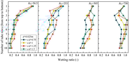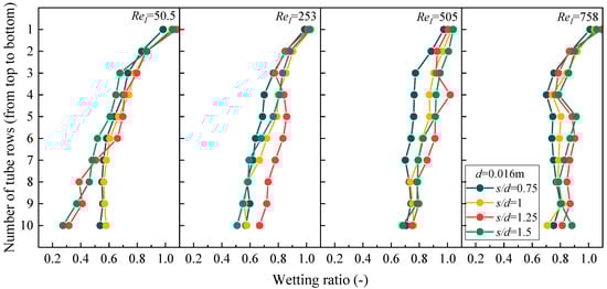 Notably, only when Rel = 758, d = 0.025 m, and s/d ≥ 0.75 does the wetting ratio of Rows 4–6 exceed that of the first row by approximately 16%. This is because, under the sheet flow pattern, the liquid film is thinner for a larger d value and more affected by the upper row’s central fluid impact, causing axial spreading beyond the initial length. It can be concluded that increased fluid flow rate, d, and s all promote a longer liquid film length. For the falling film heat exchanger design, if the process-required spray density is small (Rel < 505), then reasonably control the number of tube rows, or add liquid replenishing/flow-disturbing devices near Rows 4, 5, and 8 to extend the falling film length and expand the gas–liquid contact area, improving the heat/mass transfer performance. If the spray density is large (Rel > 505), add flow-disturbing devices to the Rows 2–3 surfaces to enhance the disturbance and to reduce the upper rows’ fluid surface tension influence, preventing an excessive wetting ratio reduction.